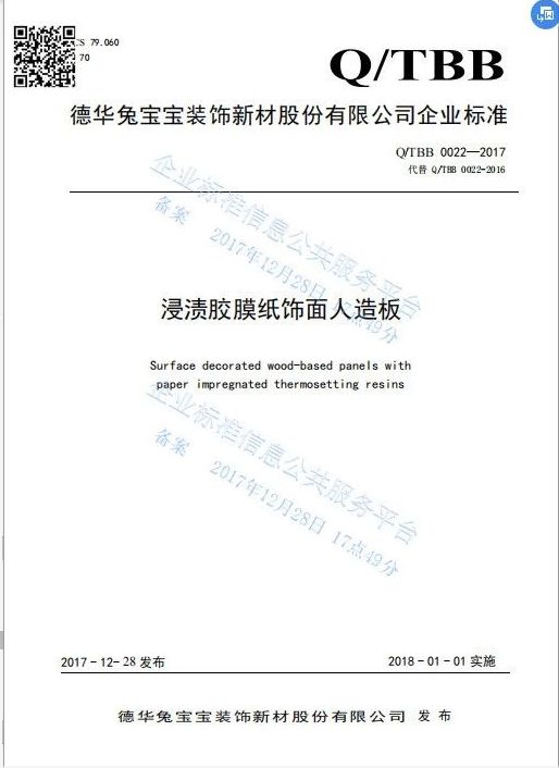 Q/TBB 0022-2017《浸渍胶膜纸饰面人造板》于2017年12月28日在“企业标准信息公共服务平台”发布,根据《企业标准自我声明公开和监督制度》内容规定,企业享有公开的权利和义务包括:(1)企业有权依法自行确定公开标准信息的内容和形式,有权对公开标准信息进行修改、更新;(2)企业应确保公开的企业产品标准信息真实、有效,符合国家有关法律法规、强制性标准及相关产业政策的要求,企业对公开标准信息的完整性、真实性、准确性、合法性负责,并对标准实施的后果承担责任;(3)企业生产的产品和提供的服务应符合相应时段内声明公开的产品和服务标准的要求。