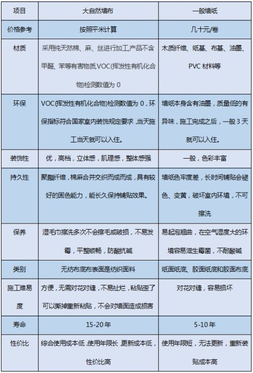 看到这里,相信大家都对墙纸和无缝墙布有了一定的了解。总体来说,两者各有优劣势,墙纸价格低廉、种类繁多,已成为大多数家装用户的首选;无缝墙布虽价格相对来说高一些,但是因为寿命长、易打理,也成为了现在很多业主的首选。那么问题来了,为什么要选择大自然墙布呢?下面做了一个对比表格: