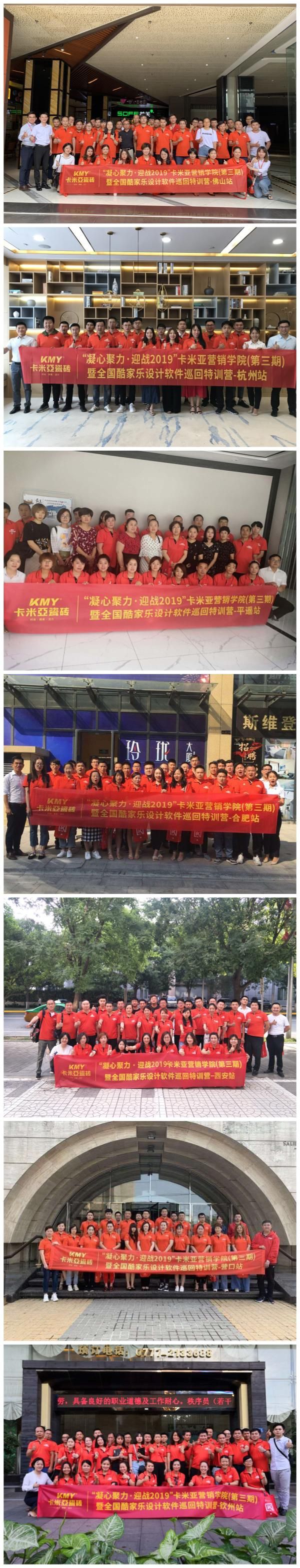 2019年6月3日至21日期间,“凝心聚力·迎战2019”卡米亚营销学院(第三期)暨全国酷家乐软件巡回特训营七站点圆满收官。广东佛山、浙江杭州、山西平遥、安徽合肥、陕西西安、辽宁营口、广西钦州,七个站点三百多位学员通过每期两天一夜的集训,对产品搭配、应用设计、酷家乐软件操作等课程进行全面学习及实操演练,有效提升终端营销人员的设计及营销服务技能。