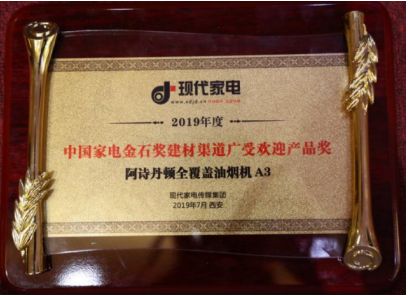 7月2日,首届中国家电行业建材渠道财富峰会颁发“2019年度中国家电金石奖”,阿诗丹顿全覆盖油烟机A3经专家评审团评审后,获评“中国家电金石奖之建材渠道广受欢迎产品奖”。