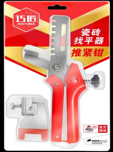 瓷砖找平器推紧钳是专业找平施工流程中必不可少的一个工具。巧匠瓷砖找平器推紧钳相比市场同类产品的优势有:①金属部分选用的是中炭铁皮,厚度达到3mm,且做了电镀防锈表面处理,结实牢固。此外,手柄选用PP材质,比市场上的PVC手柄韧性高,经久耐用;②可拆装和移动的多档设置,可配合大部分主流规格找平器施工;高度调节螺丝旋钮的设计,传动力方便调节,适应于不同厚薄度的瓷砖铺贴卡位;③整体结构为省力杠杆设计,夹紧力度大,不松脱。