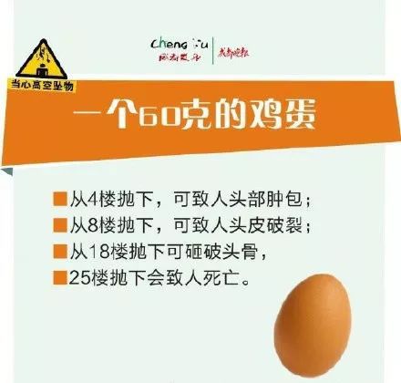高空抛物的威力到底有多大?有调查显示:一个鸡蛋从8楼抛下可让人头皮破裂;一个铁钉从18楼坠下,可能会插入行人的脑中;就算是一块西瓜皮,从25楼抛下都可能让人当场丧命。