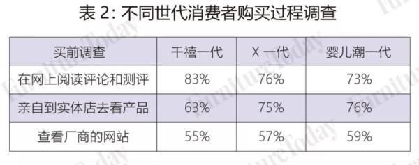 所有消费群体都非常重视网络调查。在阅读消费评论方面,X一代(1956~1977年出生的人)和婴儿潮一代分别占比76%和73%,而千禧一代则达到了83%。