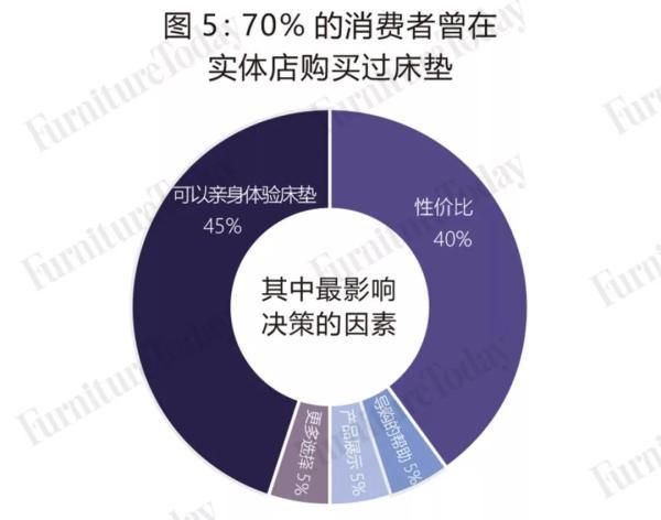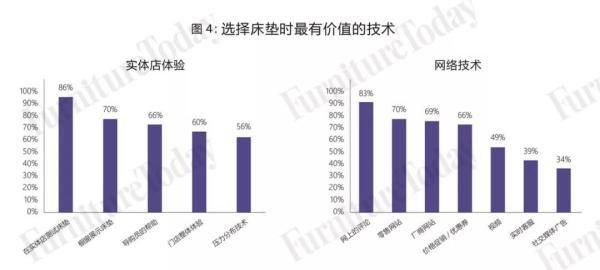 网购床垫的消费者和实体店床垫购物者之间存在重大差异。性价比对于网购者而言比对实体店购物者来说更重要,近一半的人都认为,体验床垫是他们在实体店体验中最具影响力的因素。