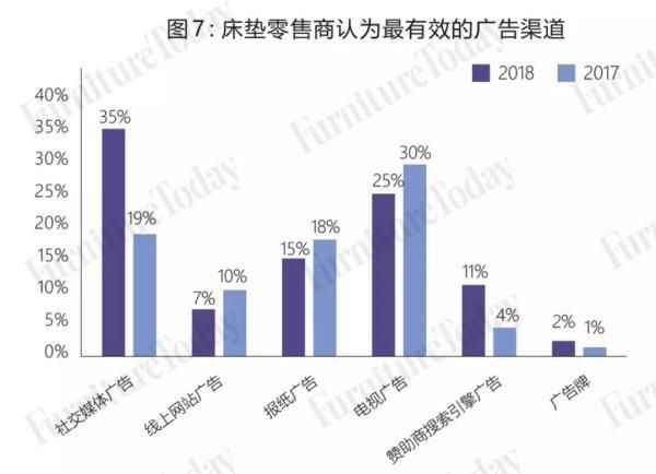 床垫零售商,投放社交媒体广告和线上网站广告的比例已经超过传统报纸和电视广告,并认为社交媒体广告是最有效的广告类型,而这些重大转变就发生在2018年,社交媒体广告在床垫市场上已经占据相当大的份额。