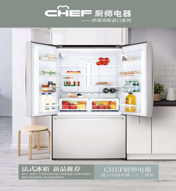 CHEF厨师法式冰箱采用北欧简约的设计理念,与现代风格设计的家庭环境相得益彰,简洁大气,独特的设计更受精英人士的喜爱。