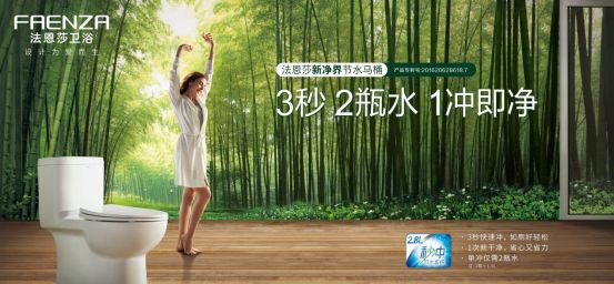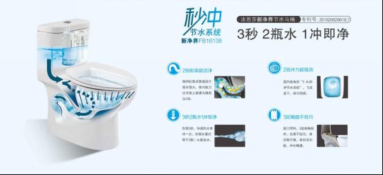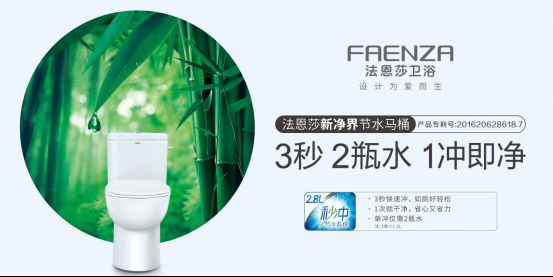 除了选材,法恩莎在产品技术方面同样注重环保。法恩莎新净界马桶FB16138刷新了卫浴行业节水记录。据权威数据统计,马桶在刚普及的90年代,以一个三口之家为例,一个6L 容量的抽水马桶每人平均一天5次,要消耗90升水。一个月以30 天计算,则要消耗2700 升水,差不多就是3吨,所以一家一年要被马桶冲走36 吨的水。全国冲水马桶每年估算冲走90 亿立方米的水量,相当于九个西湖,三个太湖,只需要四年的时间,就冲干净一个三峡大坝!而FB16138单冲仅需2.8L水量,约等于2瓶1.5L瓶装水,相比6L的传统节水型座便器节水50%以上,让如厕更环保,让水资源不再枯竭,让自然环境更加和谐。