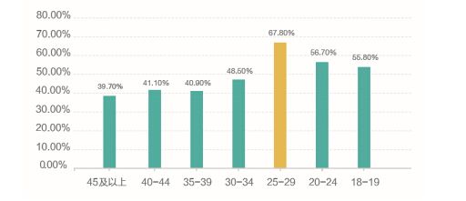 (图:全国各年龄层接受不房结婚占比图,来源:中国青年租住生活蓝皮书)