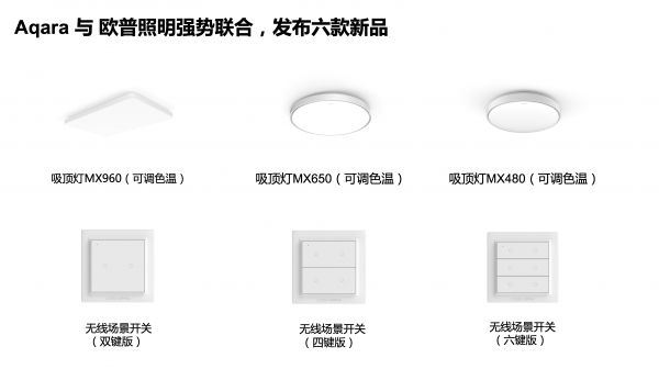 另外,Aqara还联合欧普照明,联合发布6款智能新品。包括智能吸顶灯和无线场景开关系列产品。
