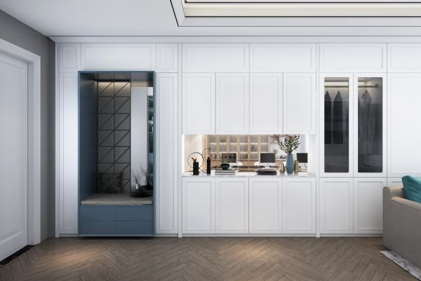 采用蓝白拼色,加入皮质软包、穿衣镜等立面造型,凸显出门厅的层次感。