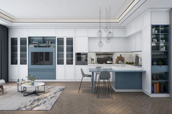 白色橱柜纯净通透,吊柜到顶设计,和客厅空间相融合,内嵌式厨电,让实用与格调在一个空间里和谐统一。靠门一侧设计开放柜,利用隔板细化收纳空间,形成丰富的展示区,也让进门的物品有处可归。