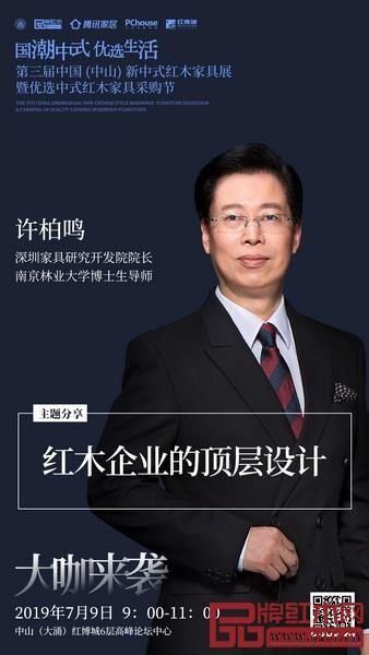 7月9日,在新中式红木展现场,深圳家具研究开发院院长、南京林业大学博士生导师许柏鸣将以“红木企业的顶层设计”为主题,从战略-战术-执行三个维度,指导企业通过商业模式的改变,赢得市场竞争。