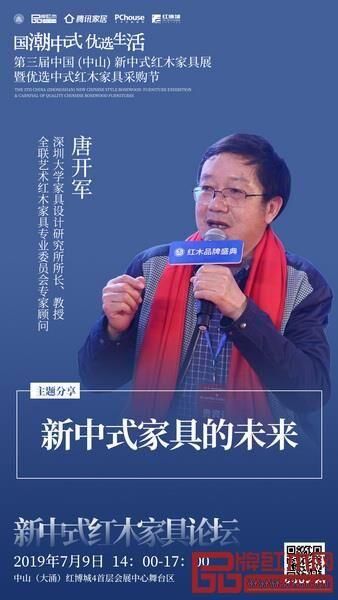 7月9日,在第三届中国新中式红木家具论坛上,全联艺术红木家具专业委员会专家顾问、深圳大学家具设计研究所所长唐开军将以“新中式家具的未来”为主题,指明新中式家具时代化的发展路径。