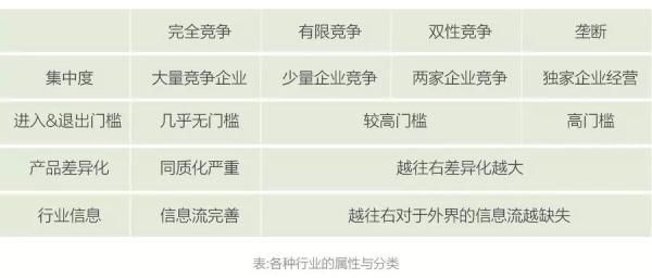同时,这个行业的首要特点是集中度低,这是由完全竞争的市场特点决定的。对于完全竞争行业而言,不仅竞争企业众多,而且进入与退出的门槛低、产品同质化现象严重,还有产业链信息完善,企业很难长时间持有不被别人模仿的核心技术,所以是典型的进入容易做好难的行业。下表是各种行业的属性与分类。