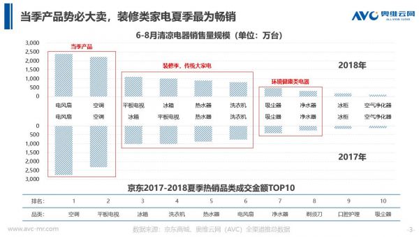 《白皮书》显示,综合2017年6-8月和2018年6-8月的京东数据和奥维数据来看,电风扇、空调、平板电视、冰箱、洗衣机、热水器这类应季家电和传统大家电在夏季更为畅销。