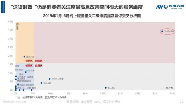 说完产品,服务也是家电消费的重要组成部分。《白皮书》明确指出家电业迎来服务消费时代,行业应关注服务消费带来的用户流量和增长空间。奥维云网语义分析系统显示,空调、燃气热水器、净水器这种安装类家电的服务关注度明显高于冰箱、平板电视、洗衣机、净化器这些非安装类产品。且送货时效是消费者关注度最高同时也是差评率最高的服务项,仍具很大的改善空间。