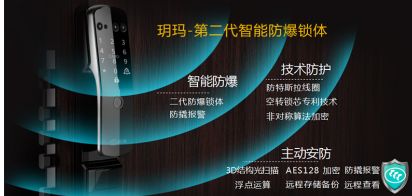 玥玛独立自主研发的三防智能门锁系统已经应用最新更高级别防盗技术--第二代智能防爆锁体,目前是行业安全等级最高。第一代防暴智能锁是给消费者最后一道安全保障,而第二代防暴智能锁在原有的高防盗技术基础上深入研究和应用互联网、人工智能、大数据以及AI,又增加了两道防线,主动安防和技术防护。具备优秀的互联网基因,互联网连接方式多选,WIFI、蓝牙以及智能家居传输433协议,并能覆盖穿透力强、更省电、信号更稳定的NB-lot,兼容4G和未来的5G。在原有的虚位密码解锁、机械钥匙解锁的基础上,拥有蓝牙解锁、APP解锁、指纹解锁、密码解锁、小程序解锁以及IC卡解锁等多种智能开锁方式。
