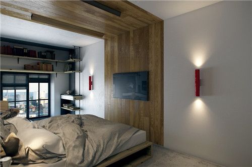 用这样抢眼的颜色装饰墙面很大胆,搭配浅色、亮色的装饰画,很个性,也很艺术,同时节约空间,木色简易实木线条恰到好处地消除单调,点缀了整面墙;与此同时,实木线条与整个室内木地板、电视置物柜、装饰立柱和谐统一,形成一种亲近自然的现代简约风格。