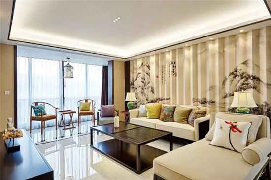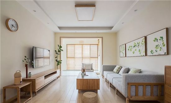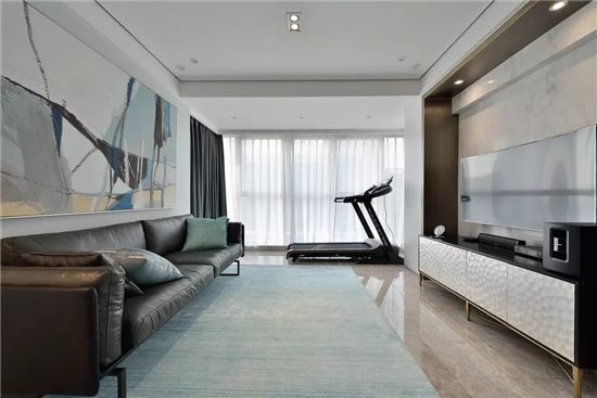 比如电视背景墙延伸到阳台的墙面,打造开阔的空间,增加空间的统一性。这个时候地面材料就没必要一致了。