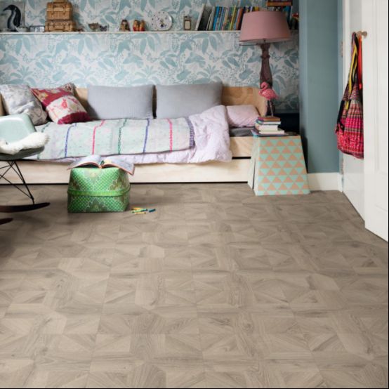 人类向来都是追求美的,不管是在日常的穿着上还是在各行各业的工作中,总是在不断的发现和探索美。正如伟大的思想家马克思所说“社会的进步就是对美的追求的结晶”。我们追求美,哪怕是家中的一角也要装扮的美美的,更何况是占家中面积较大面积的地面呢。得高Quick-step 4141地毯拼花地板,每片地板包含三块"地毯砖块",这种设计能够彰显大块花色的外观。当与长板拼接在一起,十字花融入在每个正方形中,家中单调、枯燥的地面也立刻脱胎换骨变成如同时尚艺人勾勒出来的地毯一般,充满美感和设计感,让您的家充满艺术气息。总体浅灰棕色的地面,给空间带来些许时尚感,无论是搭配怎样风格的家具都不会俗套,您的家始终都是韵味十足的。