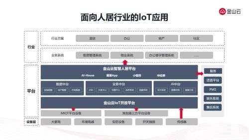 在演讲中,王建行重点介绍了金山云面向人居行业的IoT应用架构。设备层可对接米系和非米系的大家电、环境电器、安防设备、开关插座等多品类设备。在平台层,金山云提供智慧人居平台,与语音平台、PMS等相互打通数据;同时,金山云IoT开放平台支持MIoT及第三方平台设备的快速连接。