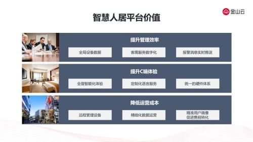 对于酒店行业而言,如何降低运营成本,提高运营效率,是管理者亟需解决的问题。金山云自建的中台能力可将底层基础数据更好服务于上层的业务需求,数据中台负责分析来自设备、用户和空间的数据,业务中台包括交易中心、结算中心、消息系统、客服系统等,AI中台则包括语义转发、图像识别和视频分析。“设备主要负责采集应用于行业和场景的数据,我们的平台负责提供相关的能力支撑。比如无人断电功能,我们可以根据在公共区域的视频设备采集的图像,判断房间是否有人,从而帮助酒店降低能源消耗”。在提升管理效率方面,金山云智慧人居平台能够实现全局设备数据管理、客需服务数字化、报警消息实时推送等功能。