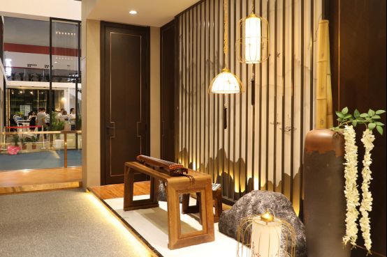 本次是华鹤木门自索菲亚华鹤门业有限公司成立以来首度独立参展,展厅设计彰显华鹤木门尊贵非凡的气度,带来一场科技与艺术完美互融的家居盛宴,展厅设有浅奢风格展示区、新中式风格情景区和美式风格展示区,浅奢的精致细腻、美式的豪华大气和中式的形神合一展露无遗。