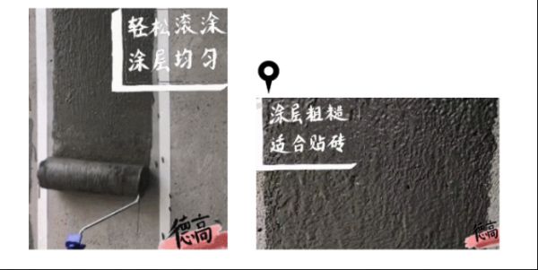 这款防水产品,与墙面粘得很好的同时,与瓷砖胶等贴砖材料也能粘得很牢固。滚涂的防水层,保证了一定的粗糙度,这样施工出来的防水层,对于保证后续贴砖牢固也是大有益处的。
