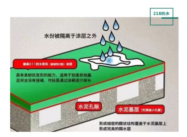 218防水原理是成膜防水,顾名思义是一种柔性很好的防水涂料,干固之后会形成一层有弹性的防水膜,就像给墙地面贴上一层雨衣一样,防止水分进入。