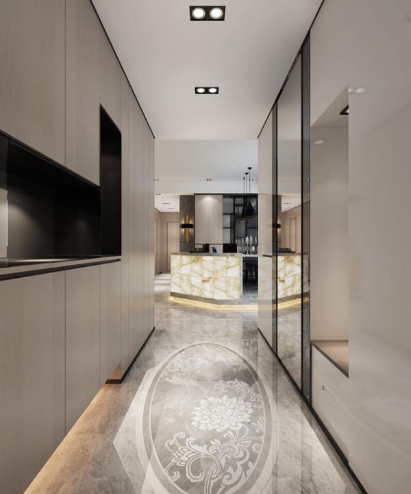 定制玄关鞋柜在腰部做了黑色留空,拉开了立面的层次感,再组合地面大理石的鲜花吐蕊纹样,入户区的整体格调得到了提升。