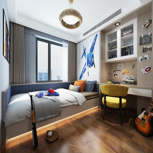 与大人们的卧室不同,儿童房里用了更多的明亮色,诸如黄、蓝两色,它们在展现这个小空间的童趣氛围上做出了很大的贡献。
