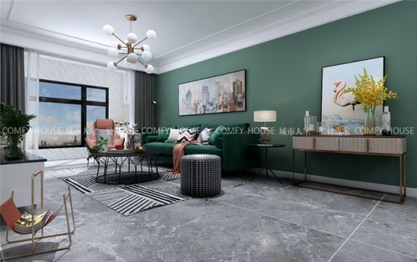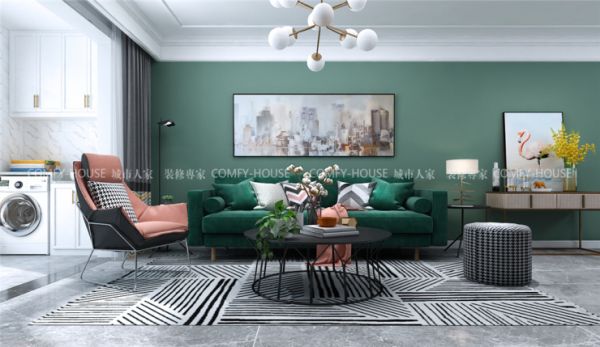 业主要求:本案是一对年轻夫妻,喜欢美式的元素,但不想那么复杂,简单美观就好,所以运用美式和现代互相结合,偏现代的设计手法,运用大胆的色调呈现不同的感受。