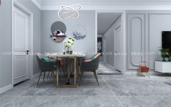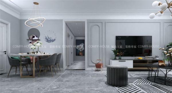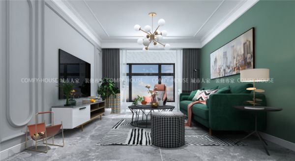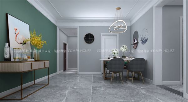 客厅作为待客区域,要求简洁明快,电视背景墙用石膏素线做了整体造型,用简单的线条勾勒,和吊顶互相辉映,涂刷浅灰色乳胶漆,沙发背景墙涂只做了简单处理,刷灰绿色乳胶漆,色彩的大胆运用使整体空间不会那么单调,有自己的特色,追求一种自由散漫之感。家具选用偏现代化,没有美式的繁重,适合年轻人居住,运用配饰来增添空间的色彩和质感。色彩上采用中性色调,稳重大气却又不失品位,又令人眼前一亮的感觉。简约中求艺术城,化繁为简,合理的简化居室,从简单舒适中体现生活的精致。