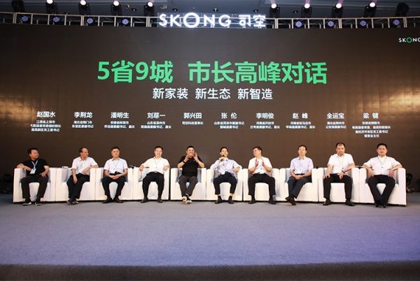 而来自5省9城的地区政府领导们,也一一登台,与郭兴田展开了一场以“新家装 新生态 新智造”为主题的高峰对话。来自山东省菏泽市委副书记、鄄城县委书记张伦,山东省滨州市阳信县委副书记、县长刘荩一,河南省开封市兰考县委副书记、县长李明俊,安徽省蚌埠市怀远县委副书记、县长潘明生,湖北省荆州市公安县委副书记全运宝,河南省驻马店市平舆县委副书记、县长赵峰,湖北省荆门市东宝区委副书记李荆龙,江西省上饶市弋阳县委常委组织部长、县高新区党工委书记赵国水,安徽省铜陵市枞阳县委常委、县政府副县长,县经济开发区党工委书记、管委会主任梁键,也分别根据各自当地的情况,对司空新家装及其所布局的全国分布式产业集群表示给予最大力度的支持。