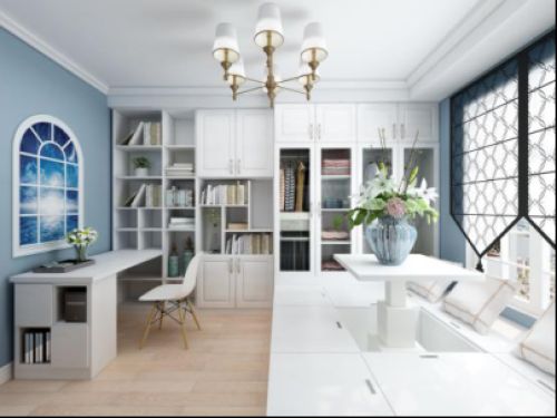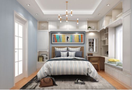 浅蓝色墙面带着静谧透亮的质感,衬托出暖白家具的明亮洁净。在原本简洁的房间,添加一些色彩感的小装饰,挂副具有纪念意义又能彰显自己品位的壁画,配上实木地板细密的结构以及天然的纹理,展现出一种清新之美,让卧室彻底降温。