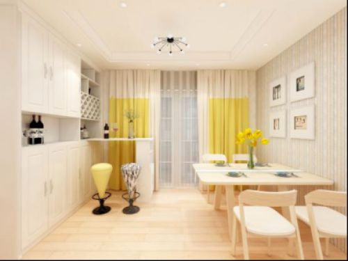 整个空间融合木色和白色,以共生的姿态传达平衡之美。窗帘和餐桌的黄元素,可以让整个房间的风格跳脱出来,让这个餐厅充满乐趣。