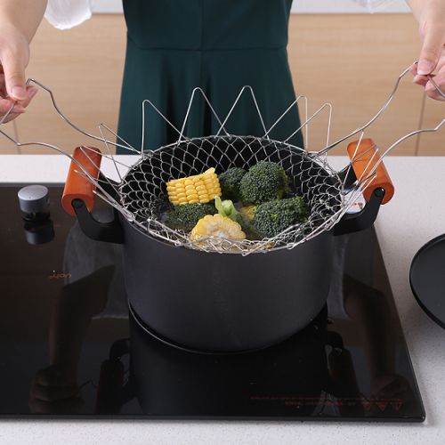 这款沥水篮,以不锈钢为材质,结实耐用;两侧带把手,可轻松从锅中提取,同时可伸缩折叠,节省空间;用于蒸煮、油炸食物,沥水沥油两用,是厨房生活的好帮手。