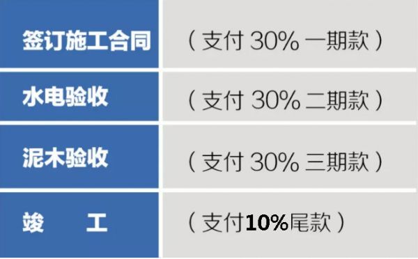 装修公司会和你说:“在签施工合同的时候支付30%的一期款就可以了,等水电施工时再支付30%的二期款,如果验收有问题的话,业主可以拒付后面的款,要求一直到整改完毕后才付,后面的款项以此类推。” 乍听上去,这样的付款方式好像对业主还挺有保障的,但事实上,等你在水电验收时发现有问题时,你已经把这部分的款项交了,主动权还是掌握在装修公司的手中。