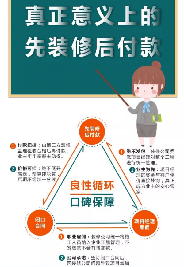 这些所谓“先装修后付款”与传统家装常见的“先付款后装修”的付款方式相比,本质上是“换汤不换药”。业主这时候可要谨慎考虑了,但是选择正规的装修公司,那就是不带任何猫腻的。