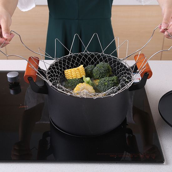 这款沥水篮,以不锈钢为材质,结实耐用;两侧带把手,可轻松从锅中提取,同时可伸缩折叠,节省空间;用于蒸煮、油炸食物,沥水沥油两用,是厨房生活的好帮手。