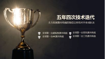 从2014年开始,海信激光电视5年进行了4次技术迭代,实现了从单色、双色到三色,从2k到4k,从100吋下探到75吋的创新。如今,海信屏幕发声激光电视及卷曲屏幕激光电视技术的突破,再次丰富了公众对于激光电视的想象力,也推动着这一显示技术成为主流。