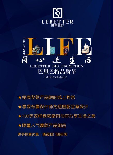巴里巴特严选品质,只为每一个用心生活的你。2019年7月8号—8月7号,线上预购互动同步进行,人气商品组合惊喜价格等你发现。想立即预约专属设计?搜索“巴里巴特生活灵感”小程序立即预约。
