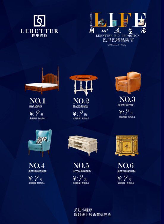 7月8号-8月7号,“巴里巴特品质节”为你联动盛启。佛山,丹阳,平顶山,天津,烟台,成都,六城联动,品质盛启。巴里巴特为你严选多个经典系列美式家具,以诚意价格,钜惠福利,让你不再犹豫,怎么选,都是对!