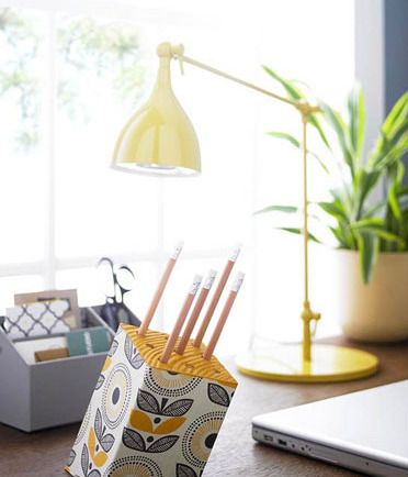 一段切有斜面的木块,看似趣味性的造型实则为了利于日常的收纳和使用。包裹上漂亮的壁纸边角料,让原木材质的笔筒多了些许观赏性。钻上和笔杆子相吻合的插孔,让收纳变成一种生活情趣。