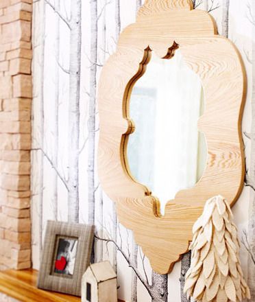 千万别被镜子的花哨外框唬弄了,其实它是由一块长5.4m的柏木切割成8段粘合成的。每块长方形板子的长度为66cm,为了使镜框上的纹理显得更自然,在粘合木板的时候翻转其中的几块。在板子的一边绘出镜框的图案设计,使用竖锯切割,在处理中间的部分时,需要先钻一个小洞,再插入竖锯。切割完的板子边缘要用砂纸打磨光滑,最后粉刷清漆,从背面卡牢镜面。
