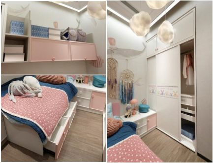 孩子的世界是缤纷多彩的,在设计风格上,儿童房的配色也不必拘泥于成人的审美,更应该迎合孩子的喜好。欧铂丽考虑到不同年龄、性格的儿童特点,为他们量身打造专属的童话空间。女孩子的公主梦,用浪漫的丁香粉,唯美的云朵灯,和匹配的云朵形状拉手去实现。而男孩子则用大面积的天蓝色点缀灰色,墙面上适当的点缀孩子最喜欢的卡通元素,衣柜柜门做卡通喷绘处理,童趣十足。