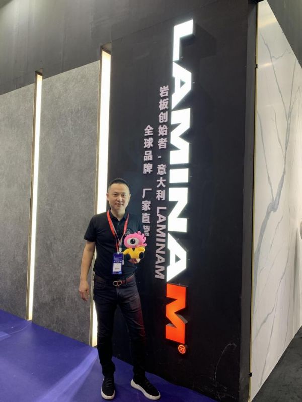 沈夏鹏:第三次,我们今年带来了Laminam品牌的产品。今年Laminam推出了两个新产品,一个更真实地呈现了天然石材的纹理,就是在视觉上能感觉纹理的突起,有立体感,摸起来有一些凹凸不平。另外一个新产品是一个视觉完全通体的产品。它今年4月份刚刚在米兰展推出来,我们今年把它带到了建博会。