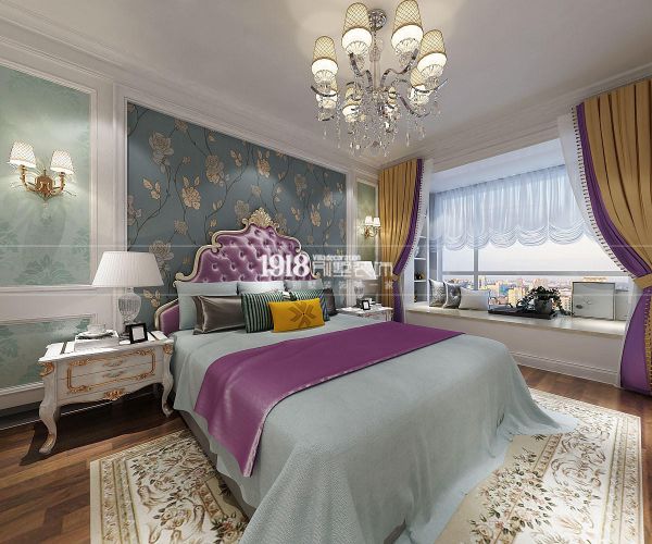在整个室内空间规划中,将主卧设计成了一个大套间,功能上配备了衣帽间和卫生间。主卧用色整体上更明亮一些,纯白的墙面加上美式的线条,高高的床背与金色饰品在两侧暖黄色的灯光的映衬下,尽显高贵典雅。配合灰色的布艺窗帘,让空间的色彩层次丰富起来。在超大的飘窗上,浸润着星辉的两杯红酒,慵懒放松的一双人影,正执手对饮,享受着难得的安静与欢愉。