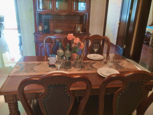 餐厅在客厅与厨房中间,空间不大,业主为保证空间的通过性,并没有在此设计其他硬装家具。尚欧国际家居质朴沉稳的木质餐桌椅,造型简单,色泽莹润高贵,让整个餐厅看起来简约之中蕴藏高级质感。