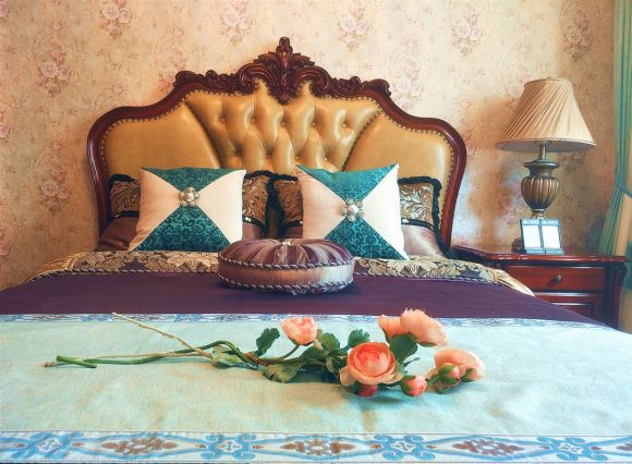 这间法式风格的卧室,首先在色泽上取胜。莹润的皮质色泽要精致的顶部雕花映衬下,显得更加高贵典雅。墙纸与床头为相同的暖色调,营造出和谐温馨的氛围,清爽的软装稍加点缀,更显活泼。